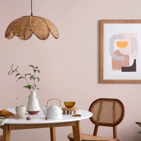 Dekoracyjna lamperia z falbanką, to modne rozwiązanie, która pozwali na zachowanie w pomieszczeniu równowagi pomiędzy jasnymi i powiększającymi optycznie wnętrze odcieniami jak klasyczny Biały, a pastelowym Różowym Brzoskwiniowym, który łączy w sobie ciepłe tony pomarańczowe i czerwone. To zestawienie nadaje aranżacji przytulność i lekkość, pięknie komponuje się z muślinowymi elementami i drewnianymi meblami. Subtelne akcenty ciepłego światła podkreślają kolorystykę w dziecięcym pokoju.