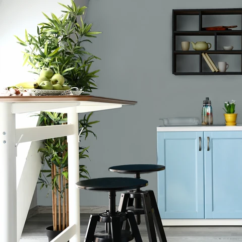 Szary to uniwersalny wybór, który wielu osobom może wydawać się nudny. Pamiętaj jednak, że szary kolor z pewnością sprawdzi się jako baza niemal do każdej aranżacji, także tej ekstrawaganckiej. Wiele jednak zależy od odcienia. Jeśli chcesz optycznie powiększyć jadalnię i kuchnię, zdecyduj się na szarość w jasnych tonach. Nieco bardziej wyrazisty efekt można uzyskać, decydując się na grafitowe tony. Jeśli obawiasz się monotonii, zestaw szary z innym kolorem, np. żółtym. W ten sposób możesz także wyznaczyć wizualną granicę między kuchnią, a jadalnią, nadając jednocześnie pomieszczeniom nieco bardziej dynamiczny charakter. Polecamy kolory Szary średni, Szary popielaty z linii Dekoral EFFECT 3in1 lub Betonowa dżungla z palety Dekoral ŁAZIENKA & KUCHNIA.