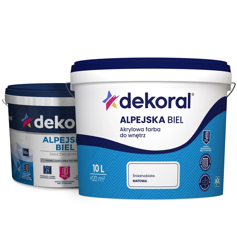 Akrylowa farba do wnętrz Dekoral ALPEJSKA BIEL przeznaczona do dekoracyjnego malowania ścian i sufitów wewnątrz pomieszczeń (tynki cementowe, cementowo-wapienne, i gipsowe). Pozostawia matowy efekt wykończenia. Odpowiedni dobór składników aktywnych oraz zastosowanie bieli tytanowej sprawiają, że pomalowana powierzchnia charakteryzuje się wyjątkową trwałością bieli i optymalną aplikacją. Produkt dostępny w sieci OBI.