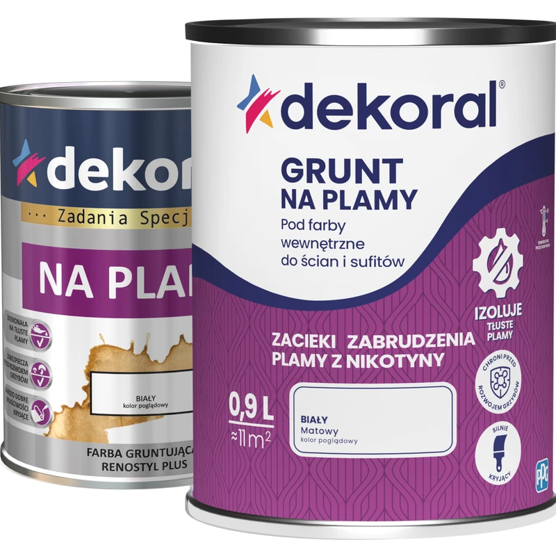 GRUNT NA PLAMY przeznaczony do pokrywania plam po zaciekach wodnych, sadzy nikotynie, tłuszczach oraz innych produktach spożywczych. Ma charakter farby podkładowej izolującej plamy i wzmacniającej podłoże przed aplikacją farb wewnętrznych do ścian i sufitów. Długotrwale zabezpiecza powłokę farby przed rozwojem grzybów pleśniowych w pomieszczeniach narażonych na działanie wilgoci, tj. łazienki, kuchnie, piwnice, pływalnie, browary, piekarnie, pralnie itp. Nie chroni tynku przed rozwojem mikroorganizmów.