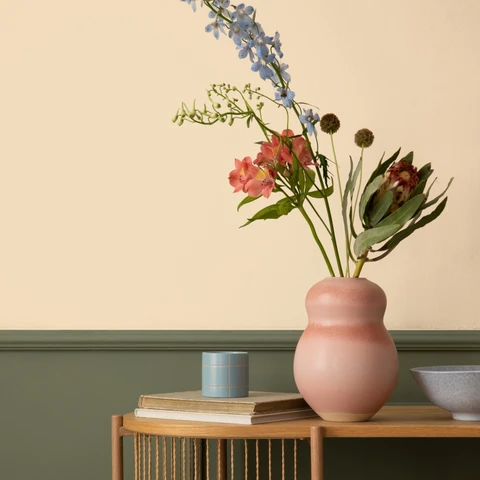 Obite w całości drewnianą boazerią ściany dawno odeszły w zapomnienie. Modną alternatywę stanowi obecnie lamperia, która zwykle pokrywa dolną część ściany. Tworzy w ten sposób wyrafinowane kompozycje, a przy tym akcentuje i kontrastuje odcienie we wnętrzu. Do podziału powierzchni ściany wykorzystaj elementy dekoracyjnej sztukaterii. Jednolity, oliwkowy pas stanowi kontrastowy wzór, a w zestawieniu z gładką górą w tonacji Ciepły beż z linii farb Dekoral EFFECT 3in1, nadaje wnętrzu wyrazisty charakter.