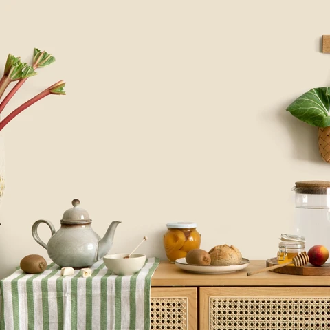 Odświeżenie starej, klasycznej boazerii poprzez pomalowanie jej na modny odcień zaczerpnięty wprost z natury, idealnie wpisuje się w ekologiczny trend zero waste. Podłużne deski w odcieniu Zielone Pojęcie emalii Dekoral EXPRES TOP pięknie współgrają z szafkami w podobnej tonacji, składając się na zjawiskową, monochromatyczną całość. Kolorystyczną równowagę stanowią blat i półki w kolorze naturalnego drewna, które dopełniają klimatyczną aranżację.